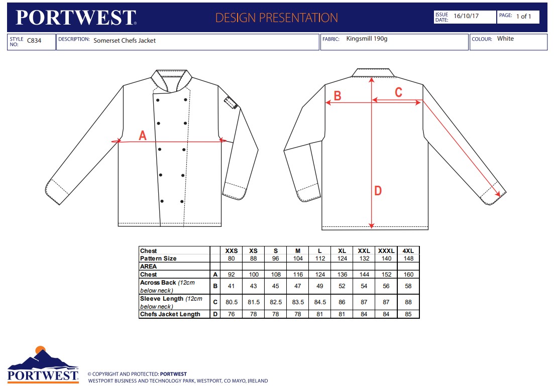 Portwest C834 Somerset Chefs Jacket L/S C834