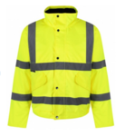 Bomber jacket manufactured from 100% 300D PU coated polyester and conforms to EN20471:2013+A1:2016 Class 3.Waterproof with taped seams, storm flap covering the 2 way zipper and a concealed hood with drawstring fastening.Tested to EN343:2003+A1:2007 - 3:1.Thick, warm quilted polyester taffeta lining with internal pocket.Two side pockets and a concealed inner storm pocket for complete protection of mobile phones and valuables.Stain resistant finish and suitable for printing.Orange version tested to GORT 3279 ISSUE 8 / RIS-3279-TOM: ISSUE 1